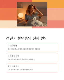 갱년기 불면증은 여성호르몬 변화가 가장 큰 원인이에요. 특히 에스트로겐이 줄어들면서 체온 조절과 감정 균형이 흔들려요. 그러니 이유 없이 열이 오르고, 갑자기 불안해지고, 밤엔 더 깨기 쉬워지는 거죠. 또 나이가 들수록 깊은 잠 단계가 줄어들기 때문에 사소한 자극에도 깼다가 다시 잠들기 어려워지는 경우도 많아요.